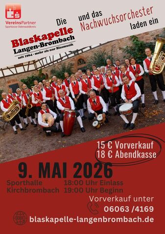 Samstag, 9. Mai 2026 in Kirchbrombach SporthalleNach 2018 gibt die Blaskapelle Langenbrombach und das Nachwuchsorchester wieder ein Konzert in der Sporthalle Kirchbrombach.